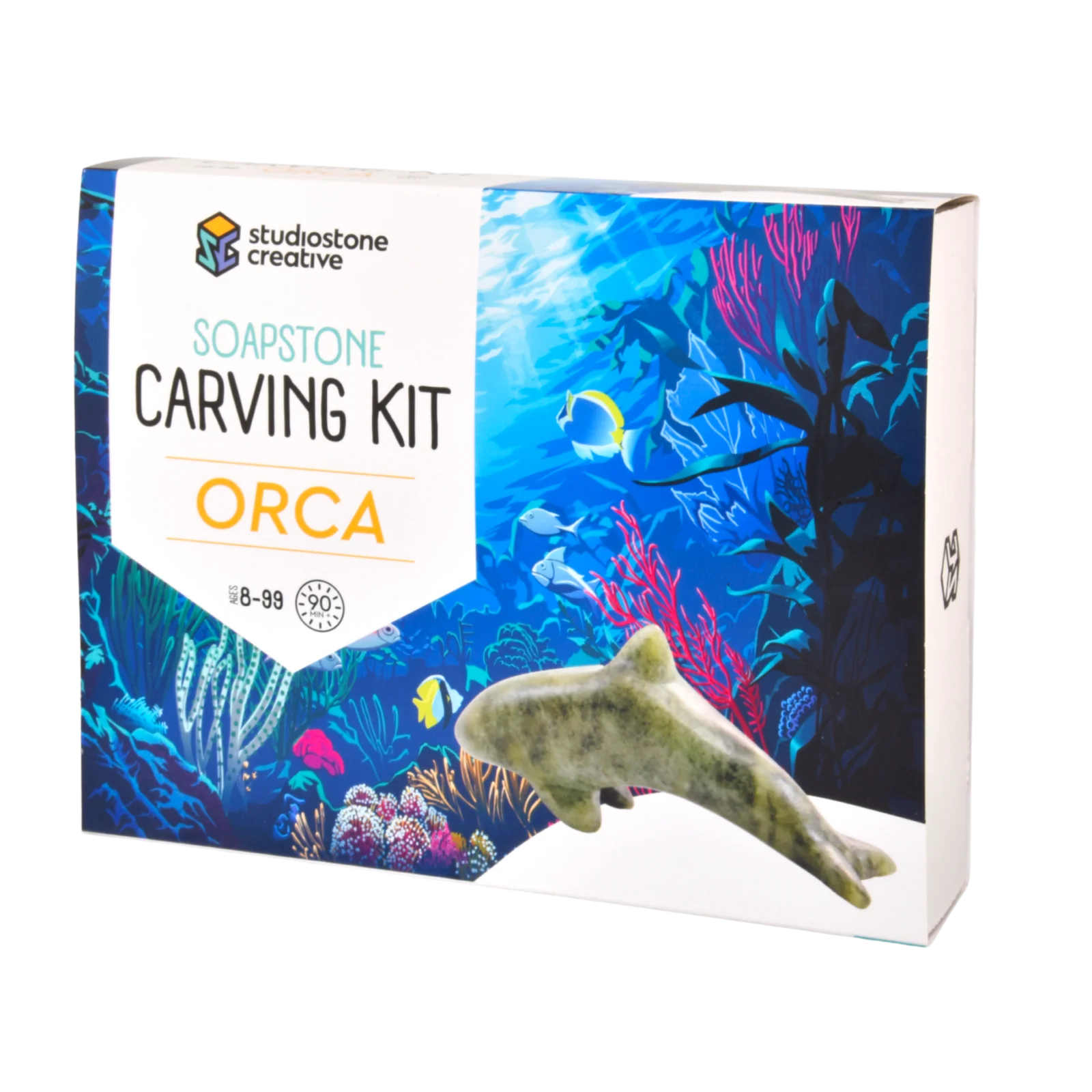 With easy-to-follow step-by-step instructions, the set includes everything you need to create your very own 3D art masterpiece: a hand-cut orca soapstone shape, a kid-safe carving file, two grades of sandpaper, polishing wax for a shiny finish, and a buffing cloth.