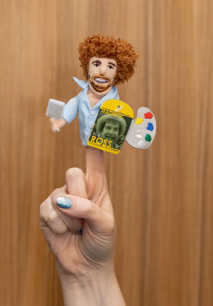 Pop our Bob Ross Magnetic Personality puppet on your finger, pick up a brush, and you can paint along with Bob Ross any time, day or night. He's also a magnet on your steel sink or the mini fridge in your studio. What are you waiting for? "Play. Have fun." On your finger, he's a puppet; on your fridge, he's a magnet, approx. 4" tall. Timeless Keepsakes~ Trendy Kitsch~ We Have It All