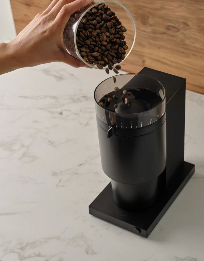 Opus is the full package. Use the volumetric dosing lid to measure beans for up to 12 cups of brewed coffee, pop the load bin lid for a grind guide so you're never lost, make precision adjustments using the inner ring, and keep your settings in check with unique no-tool calibration.