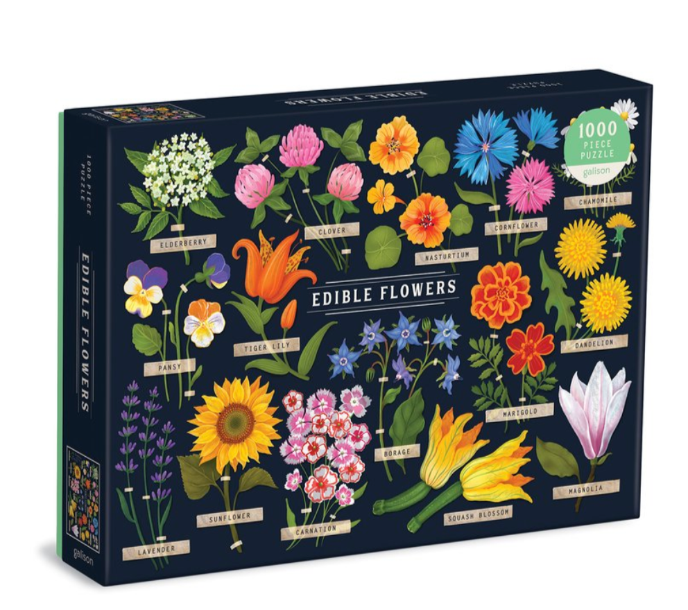 The Edible Flowers 1000 Piece Puzzle features colorful illustrations of beautiful petals we can eat, including the pansy, dandelion, carnation, and marigold. Galison puzzles are packaged in matte-finish sturdy boxes, perfect for gifting, reuse, and storage.
