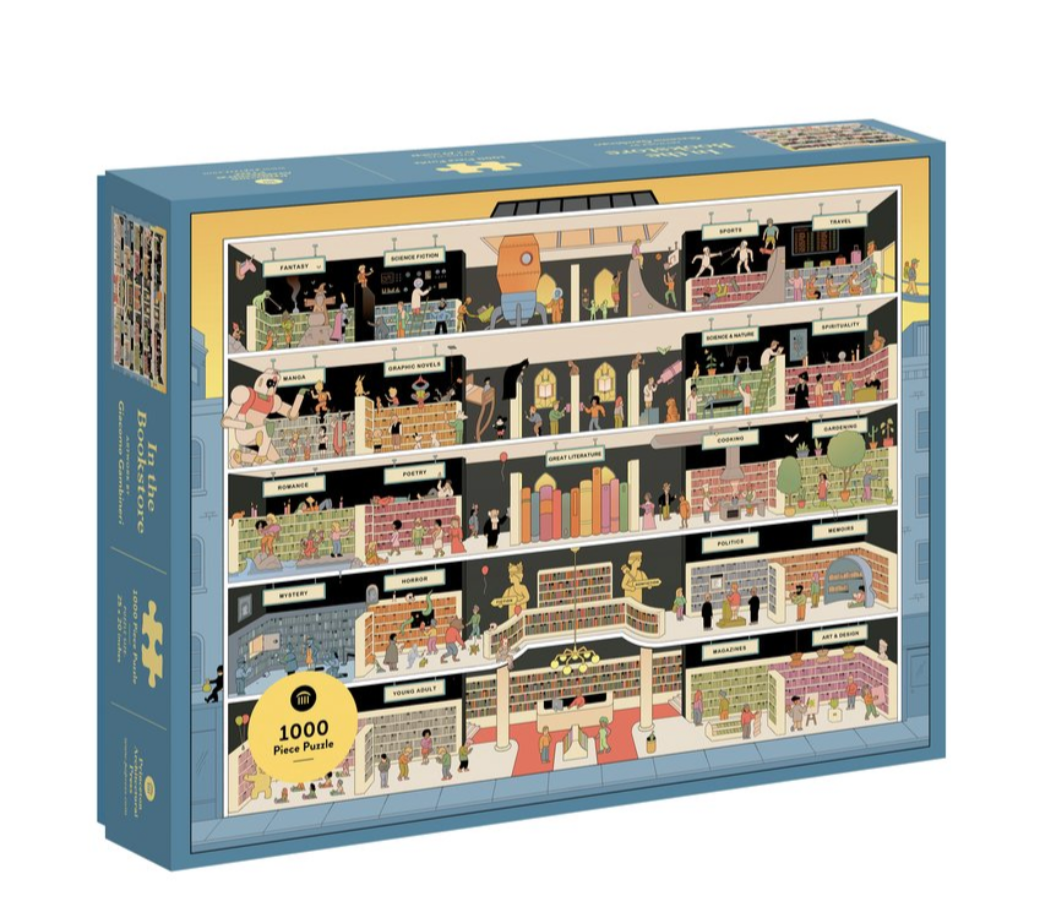 Spot each literary reference in this 1000-piece puzzle teeming with bookish activity, but be careful not to get sucked into a mysterious void in horror or swept off your feet in romance. In the Bookstore is the perfect gift for bookworms, writers, poets, and anyone who has ever felt the thrill of stepping inside a beloved bookstore or getting lost in a great book.