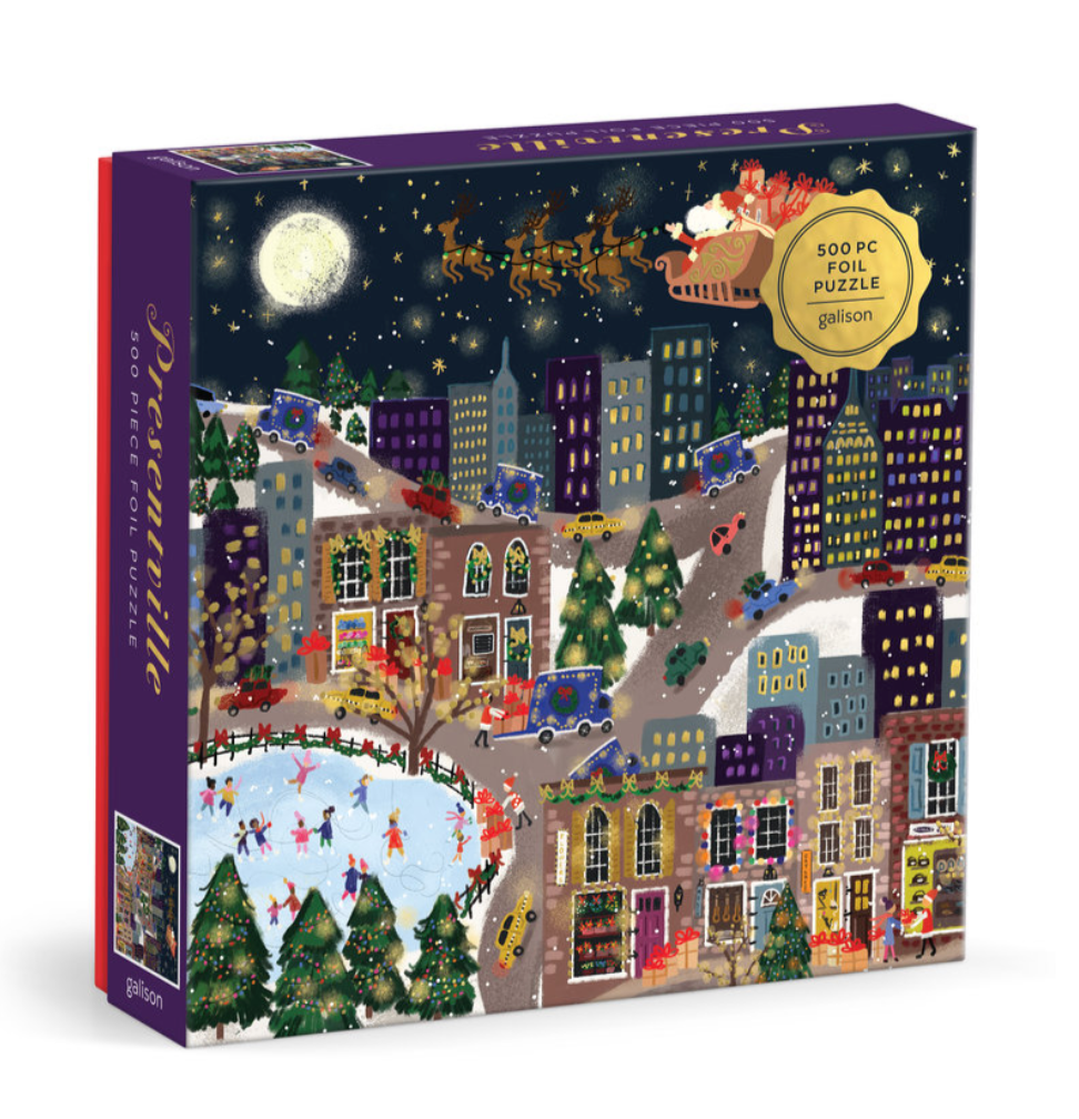 500 PIECE PUZZLE - The Joy Laforme Presentville 500 Piece Foil Puzzle by Galison features gold foil accents on a wonderful winter city scene with everyone getting ready to celebrate the holiday. This puzzle is just the right level of challenge for the whole family to join in on for hours of puzzling fun! The box includes an insert with the full puzzle image for reference.